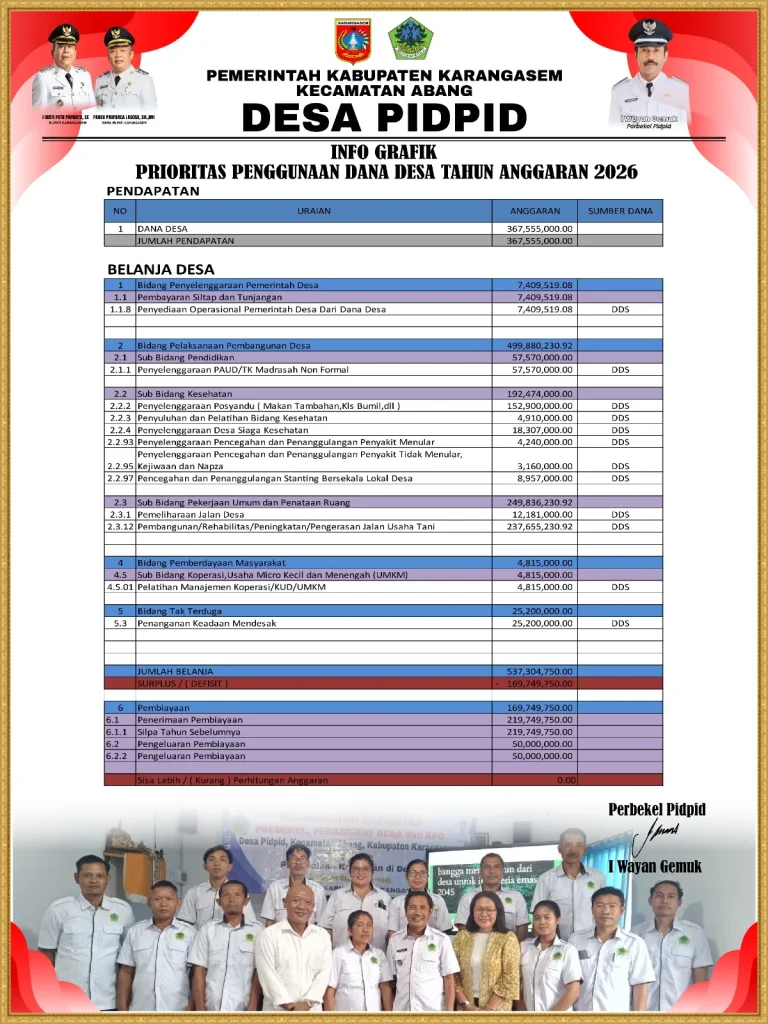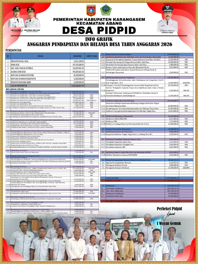 Anggaran Pendapatan dan Belanja Desa (APBDes) Tahun Anggaran 2026 merupakan dokumen keuangan resmi desa yang direncanakan dan disahkan melalui musyawarah desa untuk mendukung pemerintahan, pembangunan, dan pemberdayaan masyarakat.